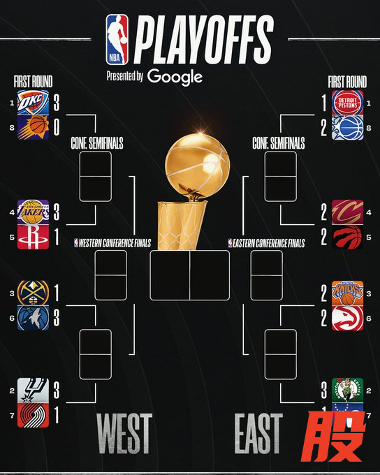 西部:雷霆3-0太阳、湖人3-1火箭、掘金1-3森林狼、马刺3-1开拓者;